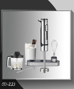 Hand Blenders are considered as essential kitchen appliances. In this regard, we have decided to introduce the Sky Deer SD-221 Hand Blender to you. This product is of great quality and efficiency. It also has a unique and stylish design. This Hand blender has a steel body, which is one of its unique advantages. The ergonomic design of the handle is also one of its features that makes it easy to use and hold the device. The on/off button of the device is installed on the upper part, which is very easy to use. In addition, note that this product is a four-purpose product that allows you to cook easily and avoid wasting time. Its functions include two types of mixer, chopper and meat grinder, which are placed on a stand, and this is one of the striking features of this product. In addition, this Sky Deer SD-221 Hand Blender has also benefited from a glass for the blender and a bowl with a lid for the chopper, the blender cup has a volume of 700 ml and the chopper bowl has a volume of 1 liter. The blades of the device are also made of titanium and are of high quality. Also, it should not be mentioned that all the parts of this product can be separated and can be put in the dishwasher for washing. Another advantage of this SKY DEER Hand Blender 4 in 1 SD-221 is the use of a powerful motor with a power of 1000 watts. In addition, the engine of this product has a low noise. Taking advantage of the turbo function is another feature of this product, whose button is located next to the power button.